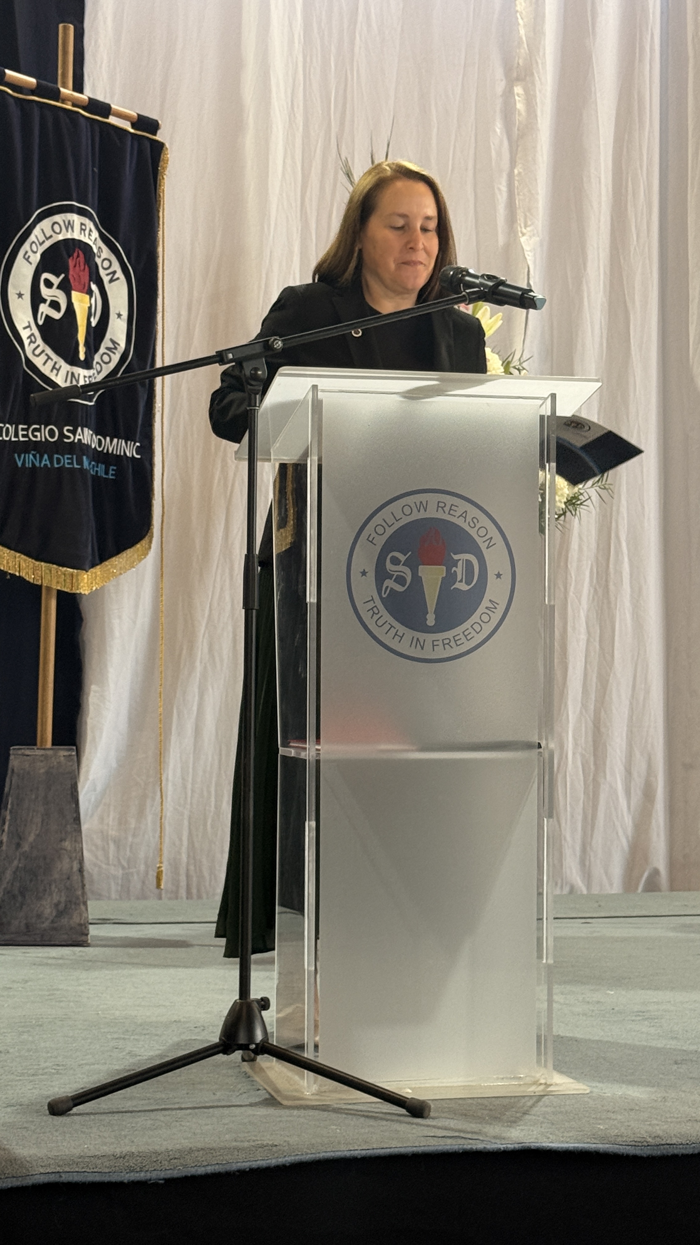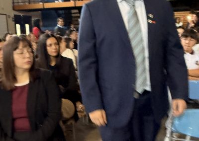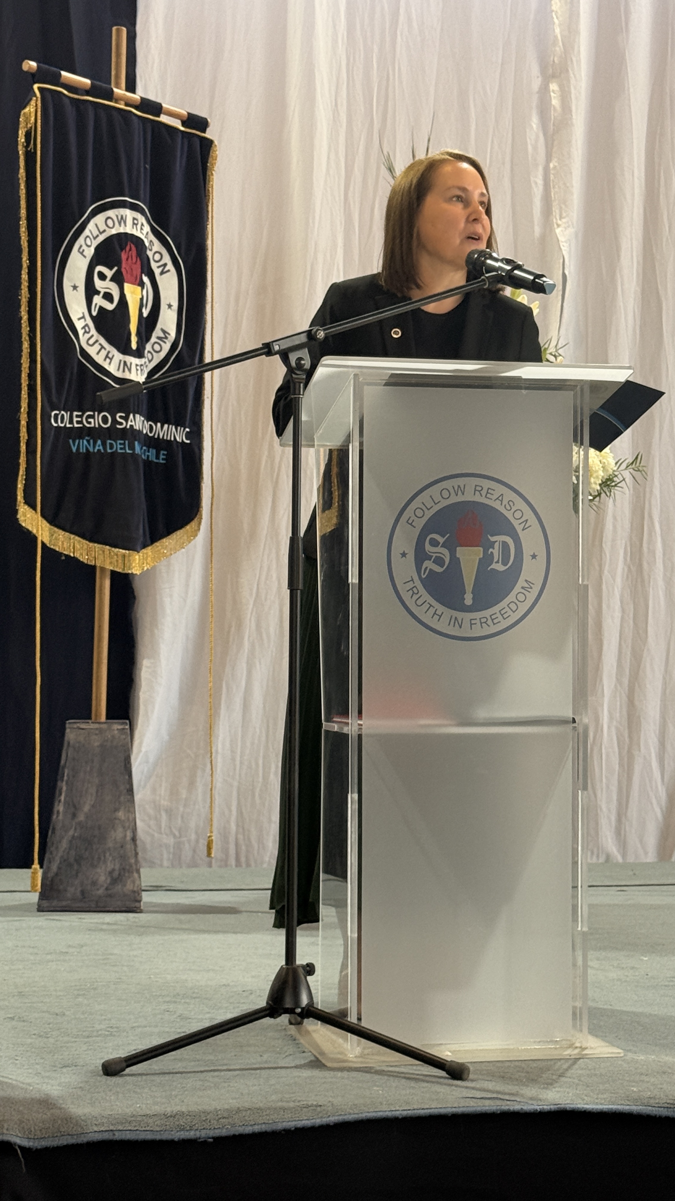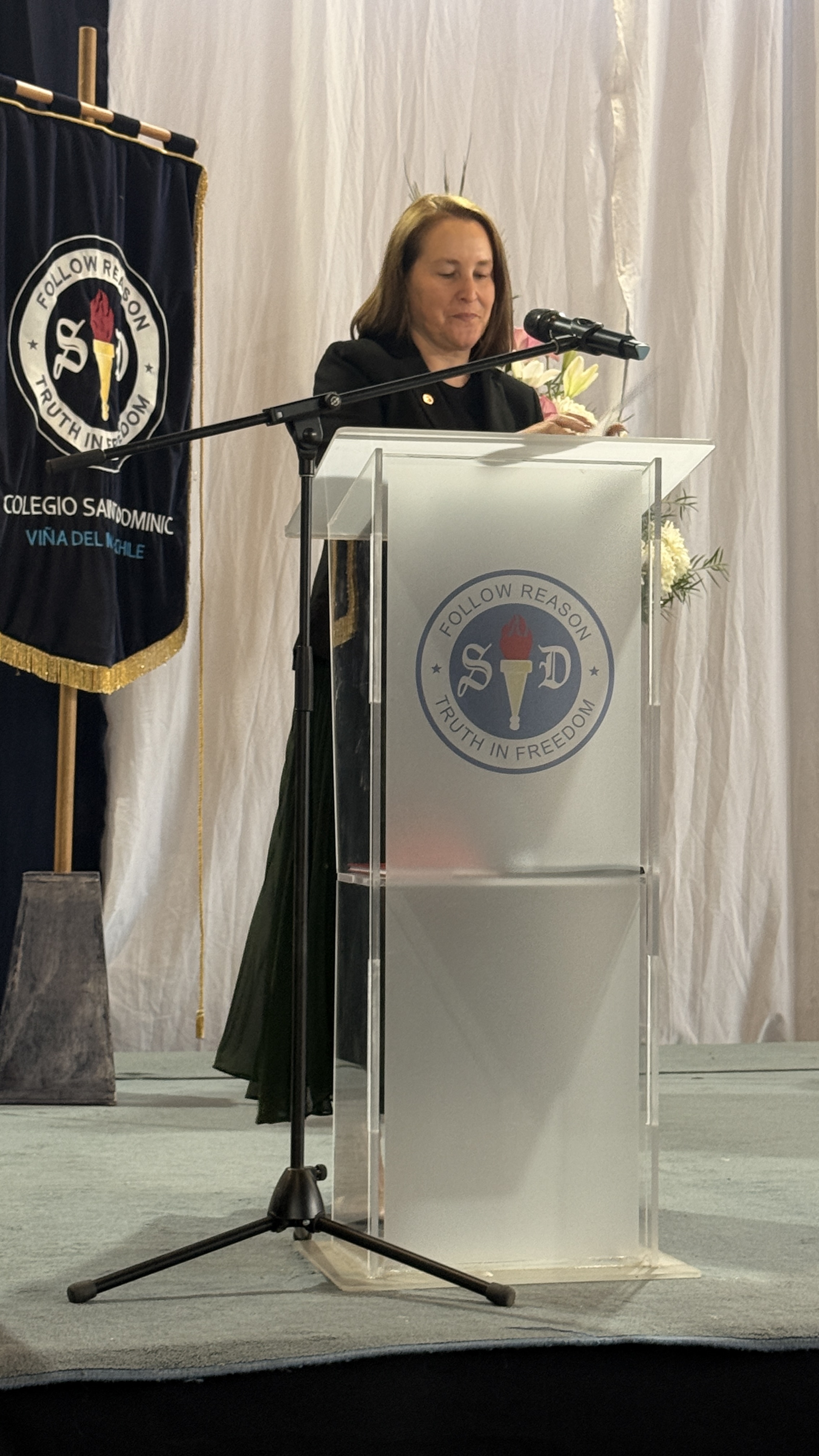 La rectora, Karen Mc Leod B., dirigió un mensaje especialmente dedicado a los estudiantes investidos, destacando el significado profundo de este último año escolar. Entre sus palabras, compartió: “Su investidura simboliza la confianza que esta comunidad deposita en ustedes. Este es el año en que se transforman en referentes visibles para todo el colegio. Asuman este camino con madurez y con la certeza de que el esfuerzo constante siempre abre oportunidades.”