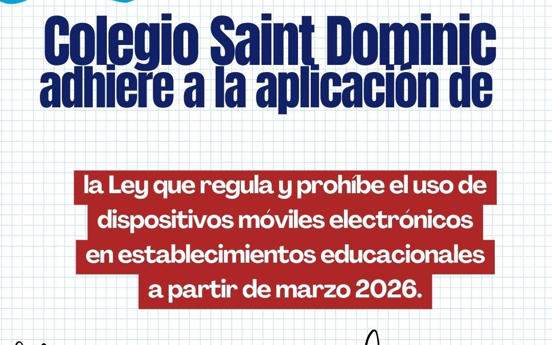 El Colegio Saint Dominic confirma su adhesión a la nueva Ley que regula y prohíbe el uso de dispositivos móviles electrónicos en los establecimientos educacionales a partir de marzo de 2026.