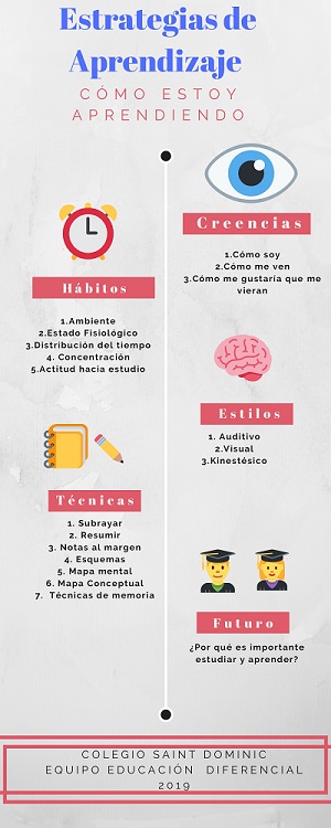 Con el objetivo de generar espacios de difusión y conocimiento sobre las técnicas de estudios y estrategias de aprendizajes requeridos para abordar las distintas etapas escolares, el equipo de educación diferencial y psicopedagogía del área psicoeducativa, realizó una serie de talleres sobre estrategias y técnicas que favorecen el aprendizaje efectivo.