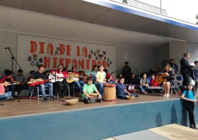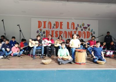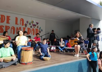 Así, del destacado legado musical de Violeta Parra, se interpretó “El Nguillatún”, recogiendo el sentir de esta ancestral ceremonia preparada por la machi y que el pueblo mapuche acompaña en las rogativas a sus dioses. Posteriormente, el tema «Todos Juntos» de la también reconocida agrupación folclórica “Los Jaivas”, nos hizo, en la voz de nuestros alumnos, un llamado a la unidad latinoamericana y mundial de este planeta “que es uno y para todos”. En este último tema destacó también la presencia del Taller de Folklore de nuestro colegio, compuesto por alumnos de Enseñanza Básica, que dirige Miss Carla Veas que danzó y deleitó a todos los presentes.