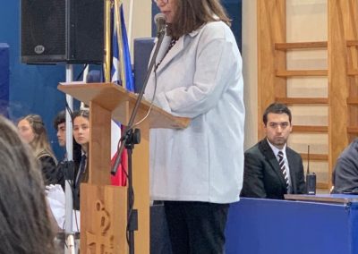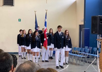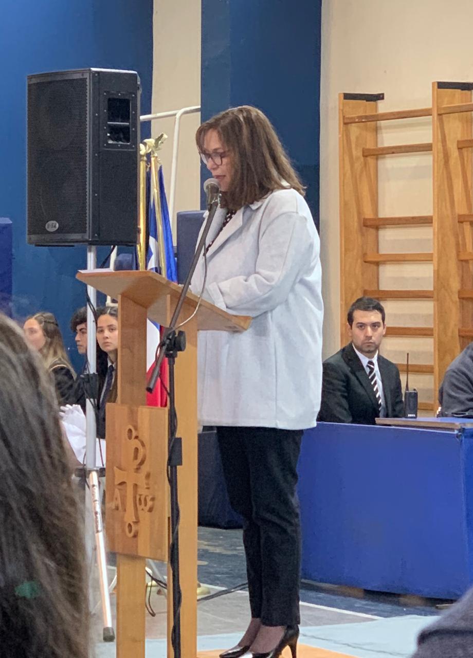 La ceremonia contó con el inicio dado por la entrada de los estandartes y a la banda de guerra del Colegio para dar paso a la intervención de la Rectora quien en sus palabras señaló “Hoy nuestro colegio es un establecimiento que ha alcanzado su madurez, siendo reconocido por la comunidad, por las características de su Proyecto Educativo” además indicó que “este estatus es fruto de los logros obtenidos a lo largo del tiempo y reflejados en la calidad de los exalumnos, ya profesionales, que durante su formación escolar fueron parte de nuestras aulas”.