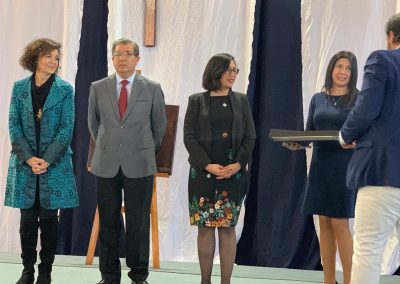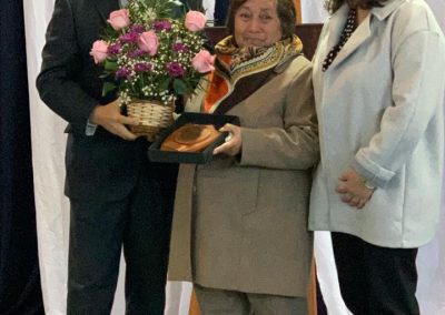 Una vez terminada la primera parte de la actividad se dio paso a un momento muy especial en el cual mirar hacia el pasado y distinguir con el recuerdo a quienes son y han sido parte de la historia de nuestro colegio, construyen el presente y nos proyectan hacia el futuro con renovada esperanza para seguir formando las generaciones que liderarán este siglo XXI. En este espacio, en primer lugar, se realizó un sentido homenaje a la trayectoria a una de las grandes que este año nos deja. Reconocimiento dirigido a al trabajo realizado día a día, a lo largo de 38 años de servicio, por una persona amable y deferente en su trato, atenta a cuanto se le requiriese, excelente compañera y de innegable calidad humana. Se trató de la Sra. Cecilia Barrera Villalobos, auxiliar del establecimiento, quien desde su función ha facilitado y apoyado la labor de distintos miembros de la comunidad educativa.