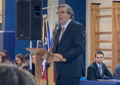 Para continuar, el presidente del directorio, Patricio Galleguillos saludó a los presentes, dedicando sus felicitaciones a docentes, alumnos y padres. Además en la oportunidad recalcó la importancia para la Corporación en cuanto al proyecto del colegio, el que persigue no solo educar pero hacerlo en valores. De esta forma indicó “en estos 71 años y en los próximos 71, lo que continuaremos haciendo es que nuestros estudiantes logren a aprender a aprender, pero por sobre todas las cosas, que aprendan a desarrollar valores”. Por lo mismo, hizo un llamado e invito a los presentes a revisar los valores que mueven nuestro comportamiento los que vienen de la casa, agregando “de los cuales el Colegio se hace parte, en especial en lo relativo a inculcar los valores de la convivencia, la tolerancia, el respeto a la familia y al compañero, que en resumen son los que nos hacen grandes personas”.