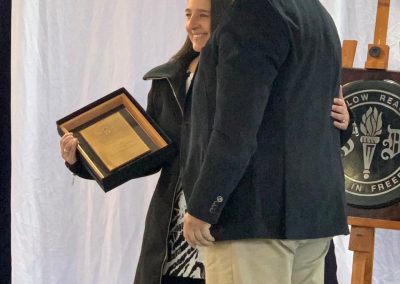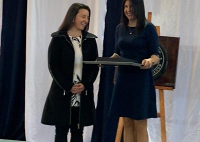 Carolina Lillo Astudillo, docente y UGP de Educación Física y Deporte, recibió de manos de Hugo Salas, Director de Infraestructura de la Corporación Docente Saint Dominic, su galardón por 20 años de servicio.