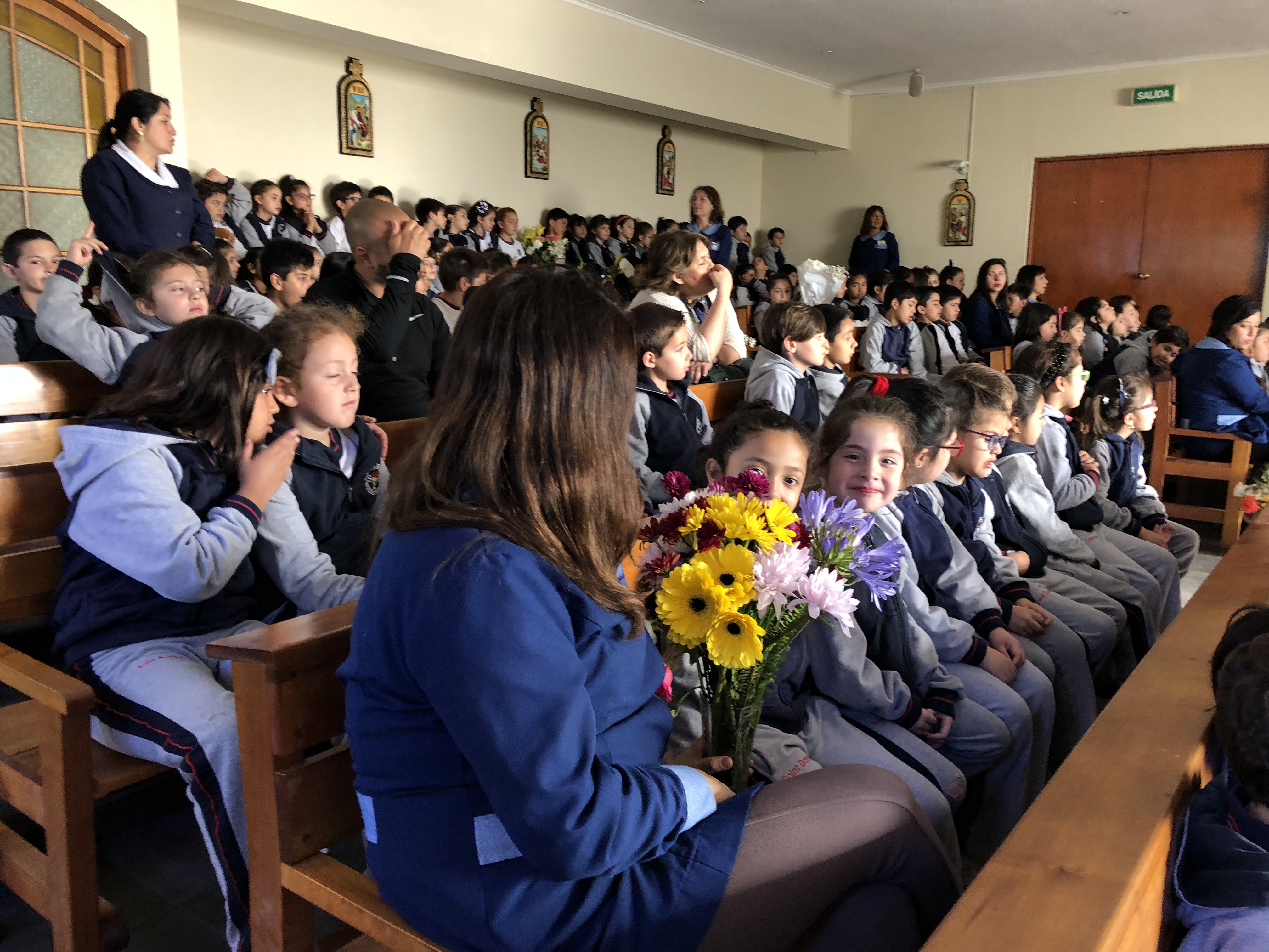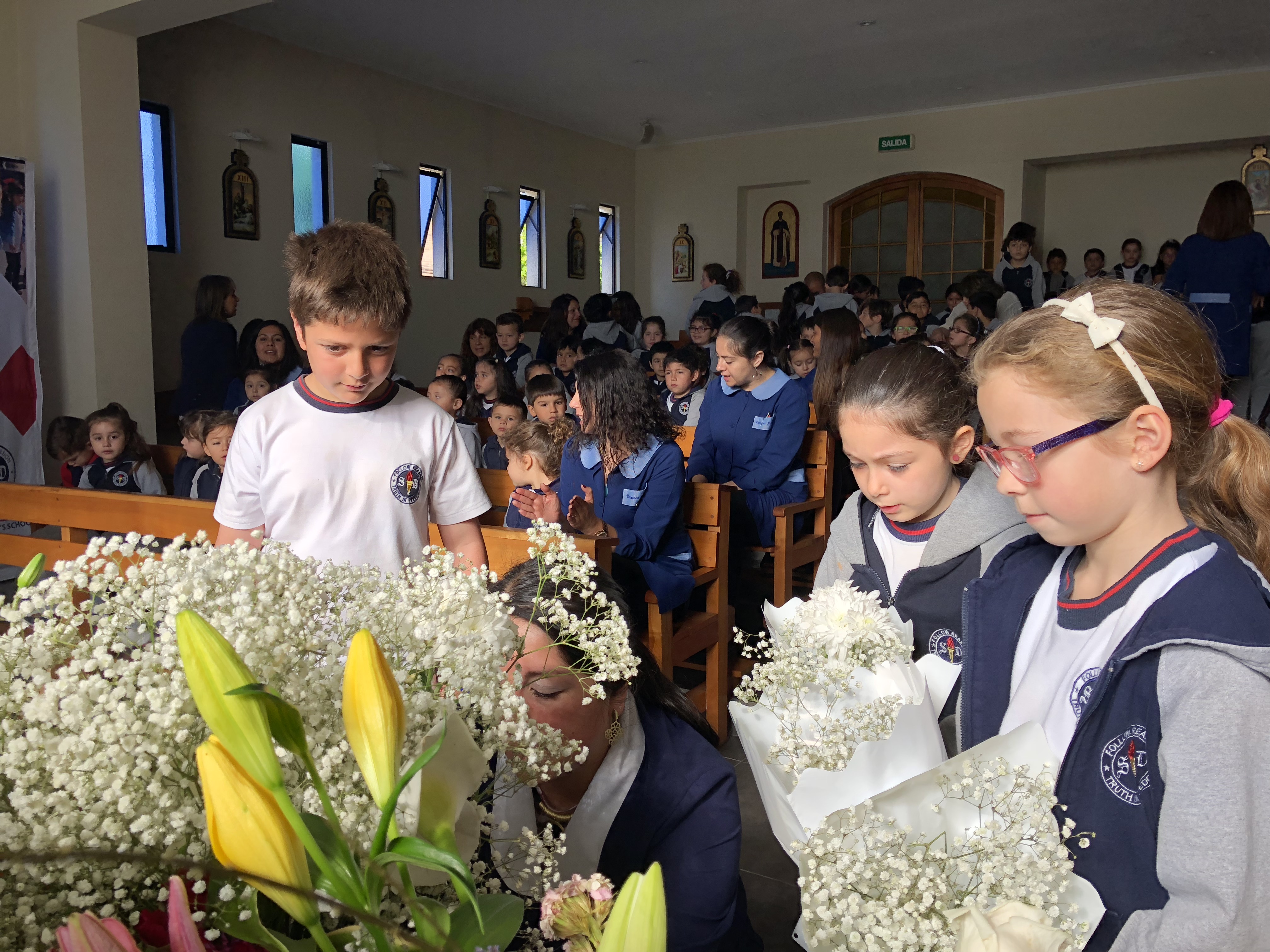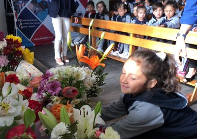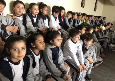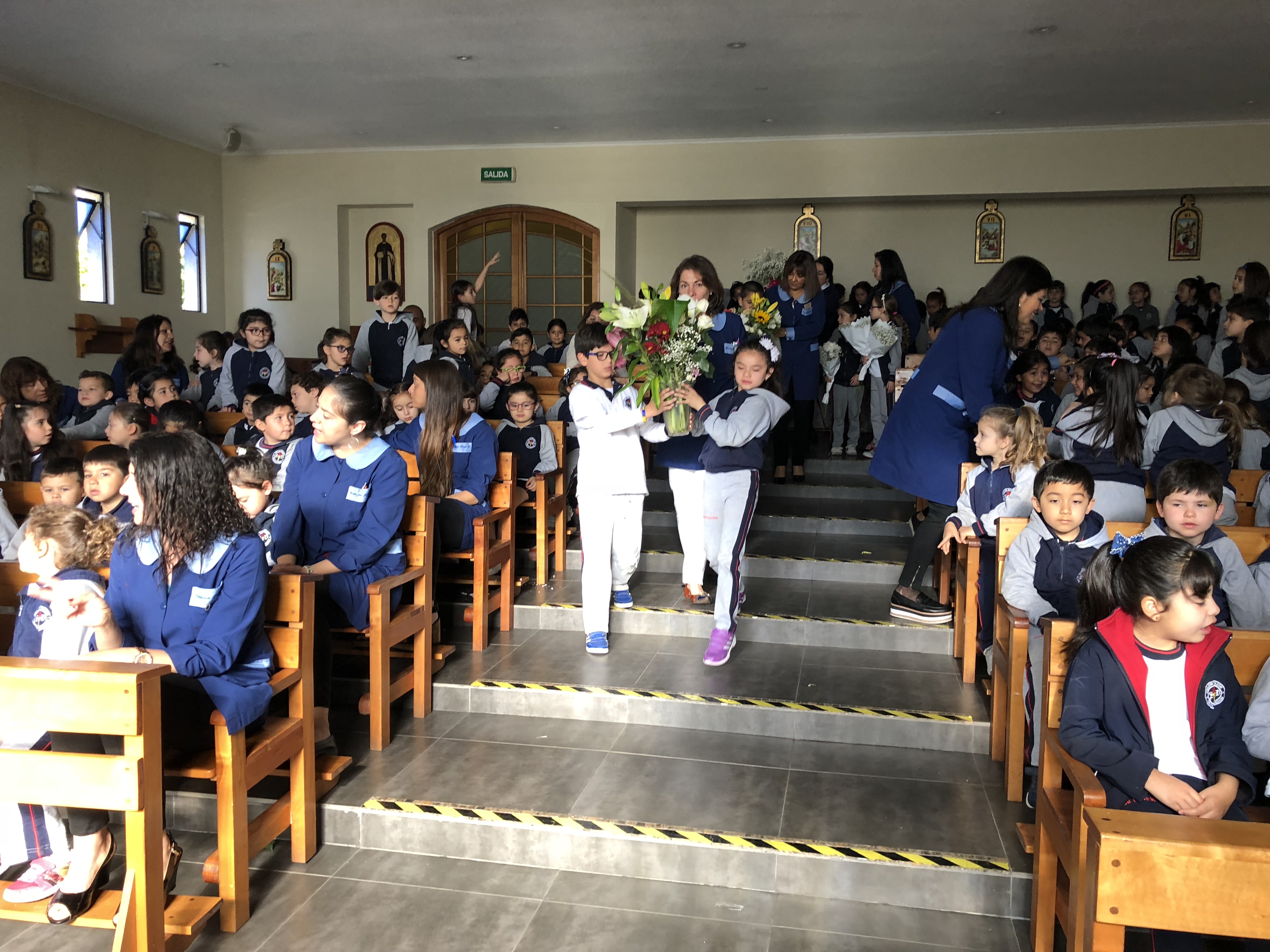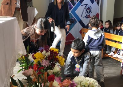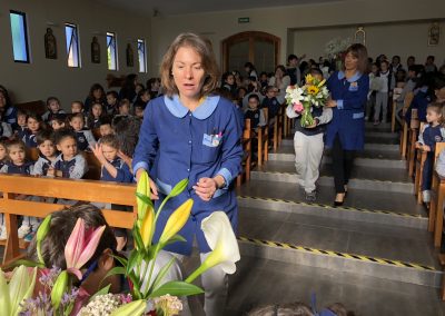 Los primero en acudir fue el entusiasta Ciclo inicial, el que con alegres cantos, llegaron a repletar a nuestra Madre con bellas flores, signo de amor y devoción que nuestro colegio profesa.