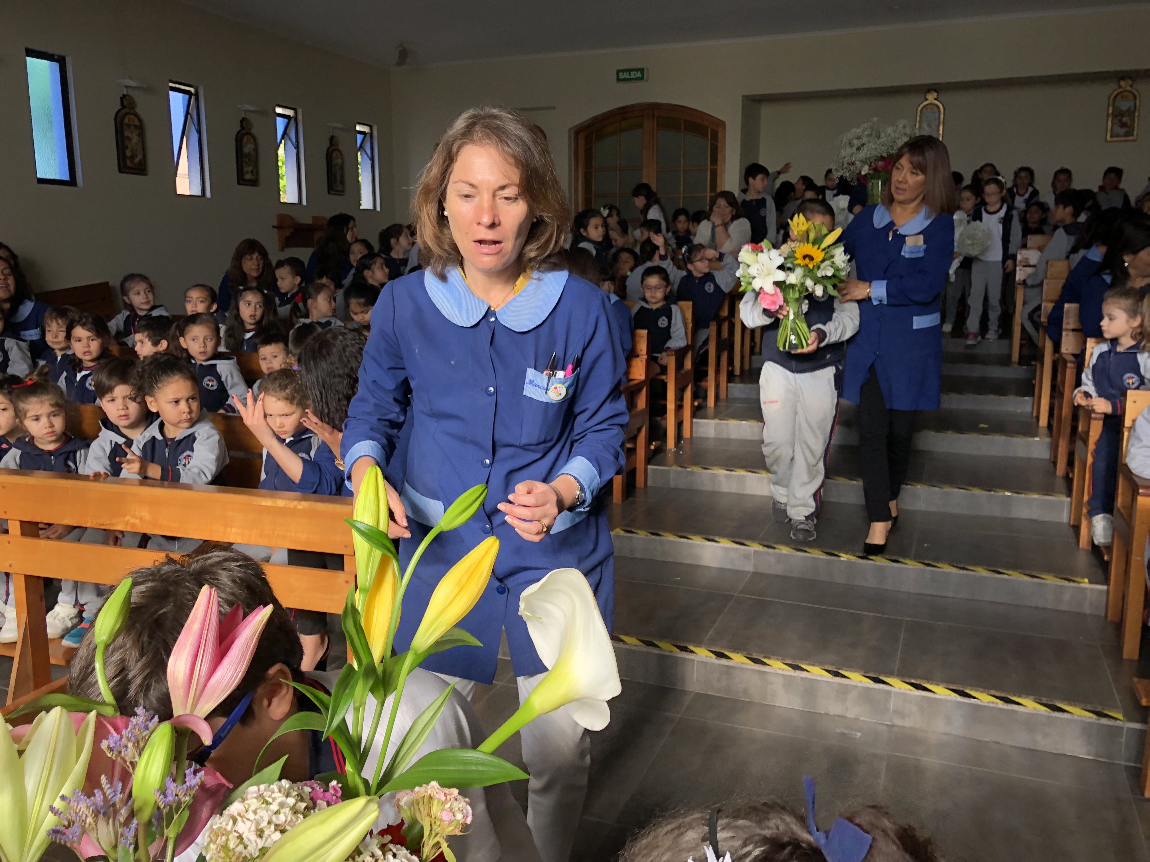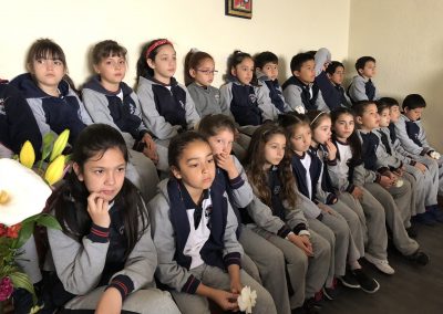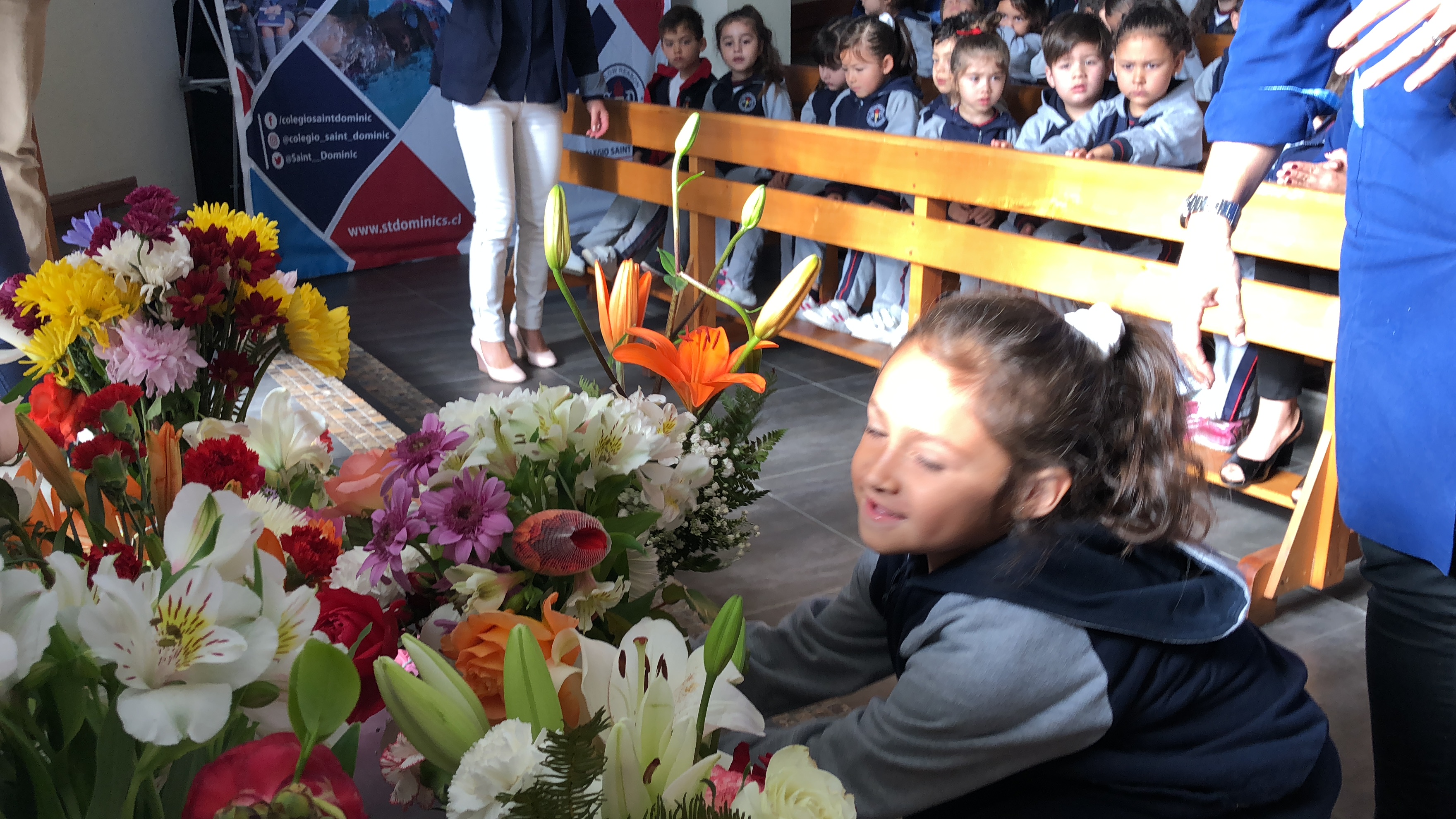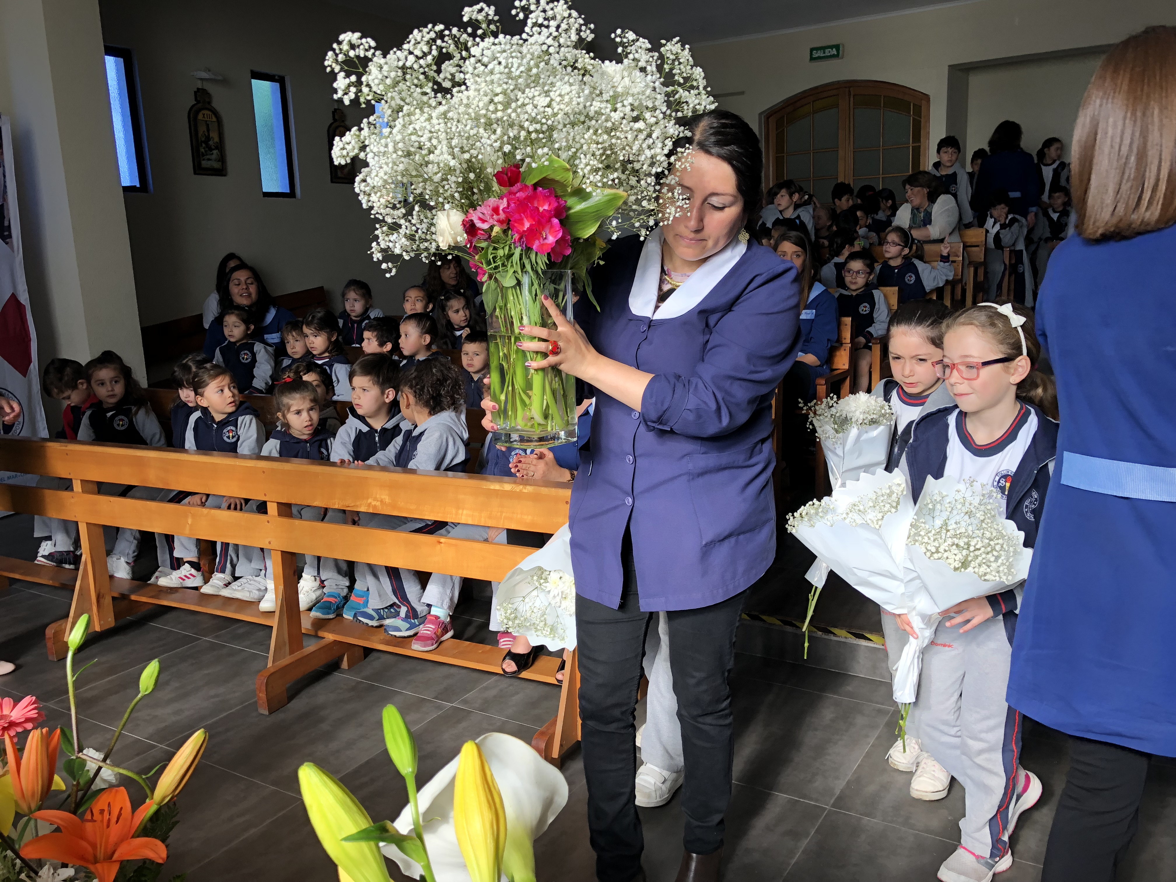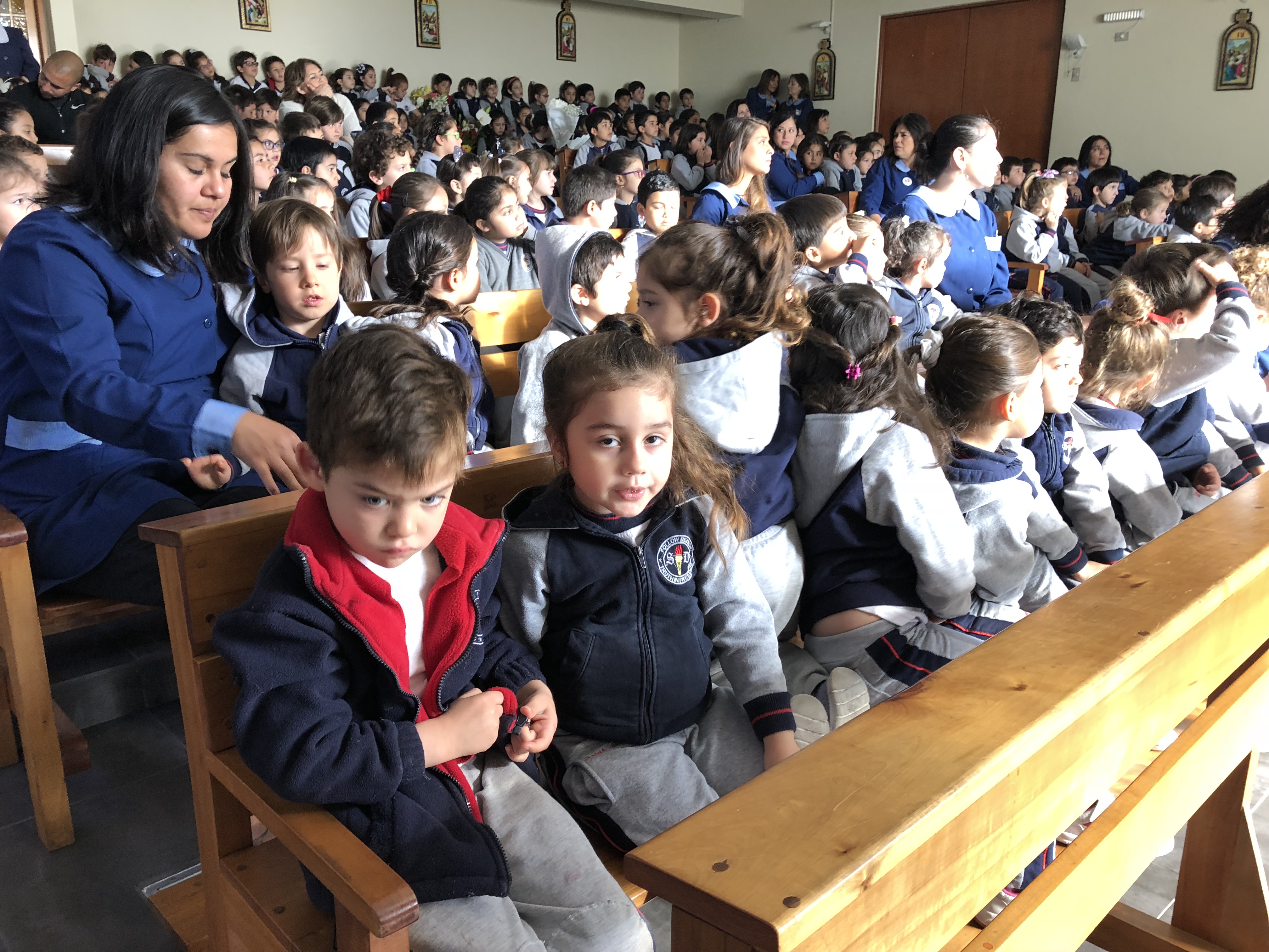 Los primero en acudir fue el entusiasta Ciclo inicial, el que con alegres cantos, llegaron a repletar a nuestra Madre con bellas flores, signo de amor y devoción que nuestro colegio profesa.