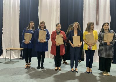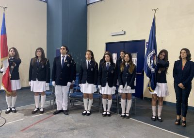 Además, se destacó a la alumna Michelle Julien , quien durante el verano pintó los murales de convivencia escolar, adjudicados en un concurso de la semana de aniversario 2019, con el lema 2020, que además fue plasmado en unas chapitas entregadas en el mismo acto a los presidentes de cursos presentes.