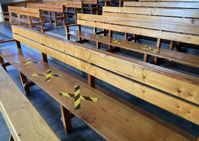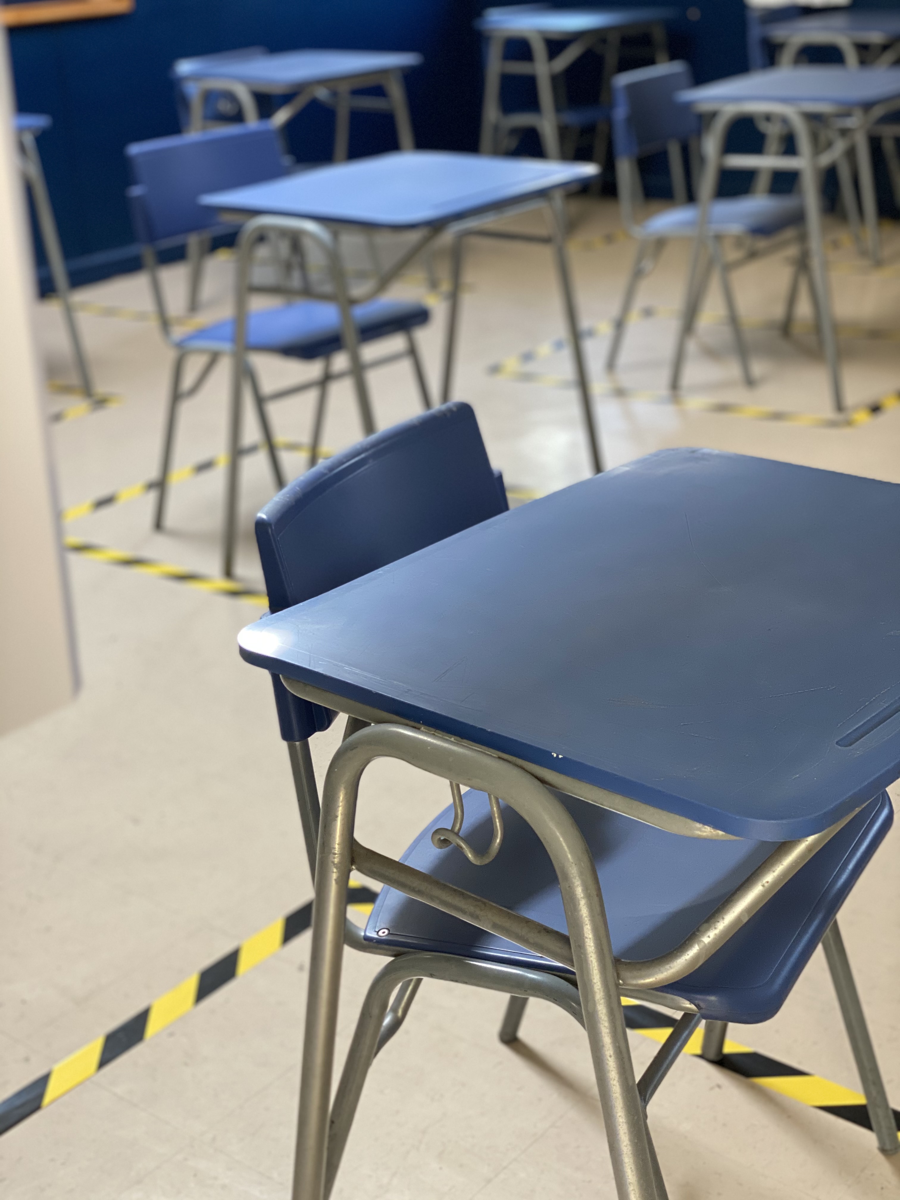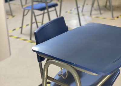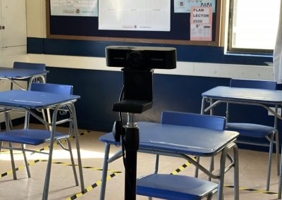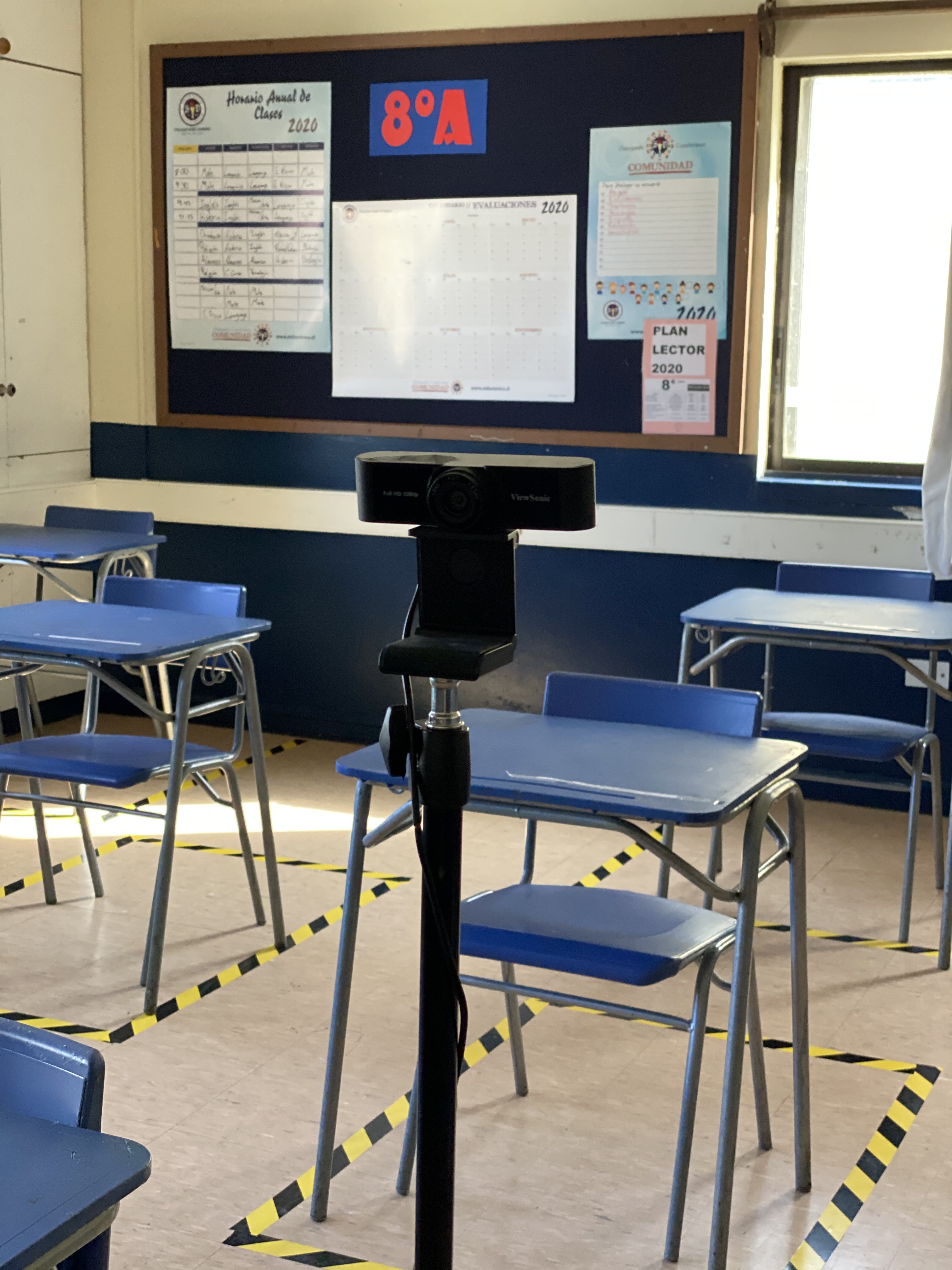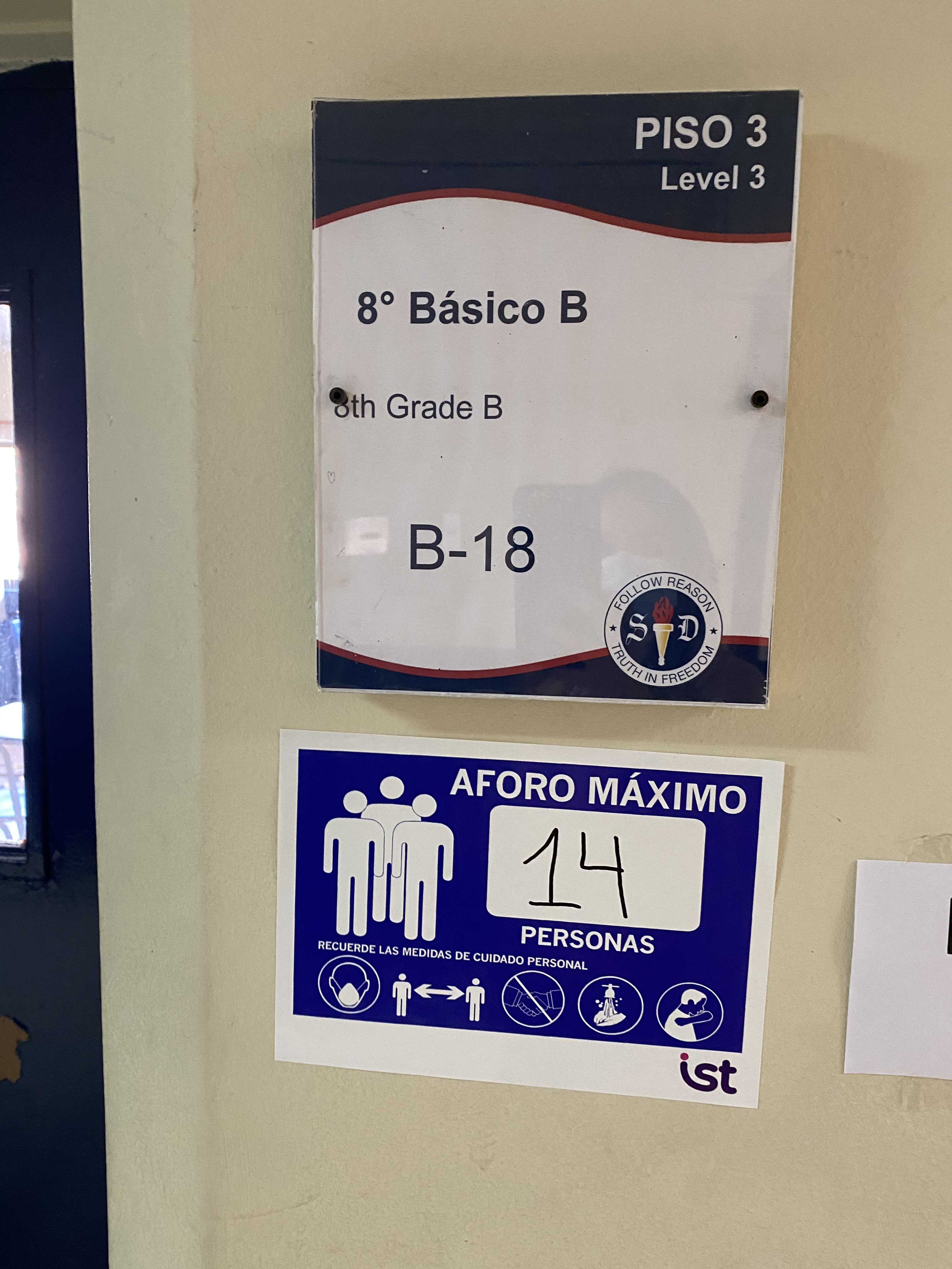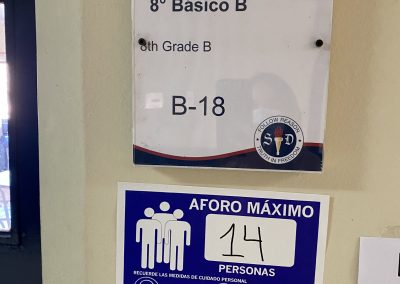 Las mesas estarán separadas a una distancia acorde a las dimensiones de la sala y no se podrán juntar ni mover mesas y sillas para trabajos grupales. Las ventanas deberán permanecer abiertas en todo momento, o se realizará ventilación cada 1 hora. El profesor deberá permanecer siempre cerca de su mesa de trabajo y pizarra, Está prohibido el consumo de alimentos durante la clase. Solo se permitirá consumo de líquido para hidratación y cuidado de la voz. Cada alumno deberá llevar sus materiales escolares, los que no podrán ser compartidos con su compañero o profesor.